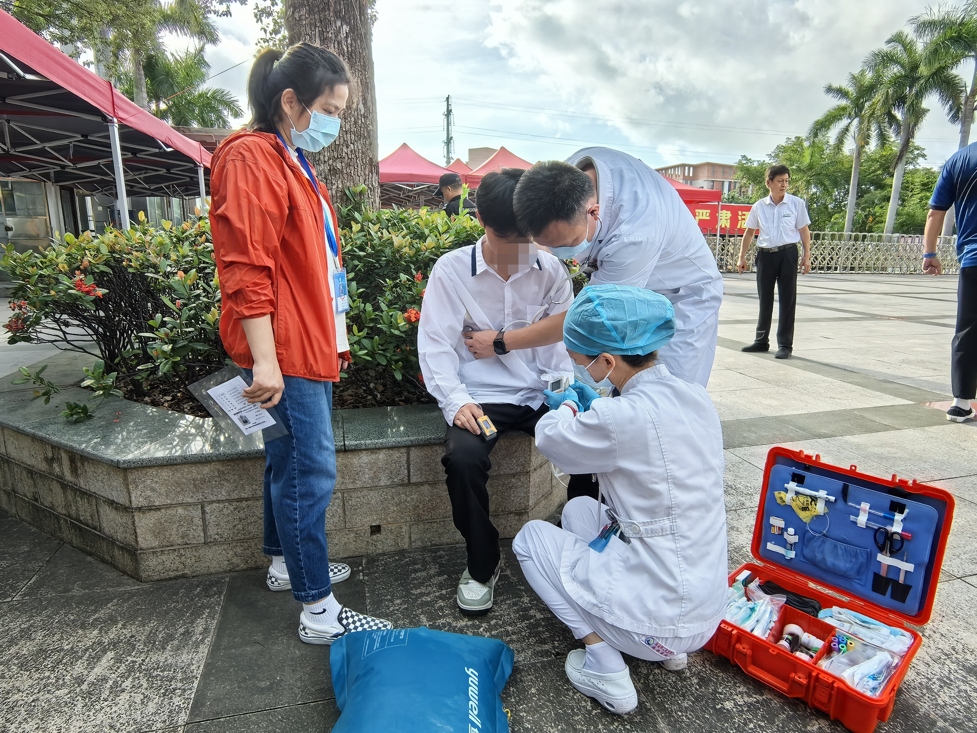 在北师大珠海附中考点,开考前,珠海高新区人民医院医生测量考生陈军(化名)血压、心跳,了解他的身体状况。
